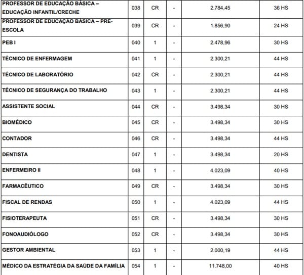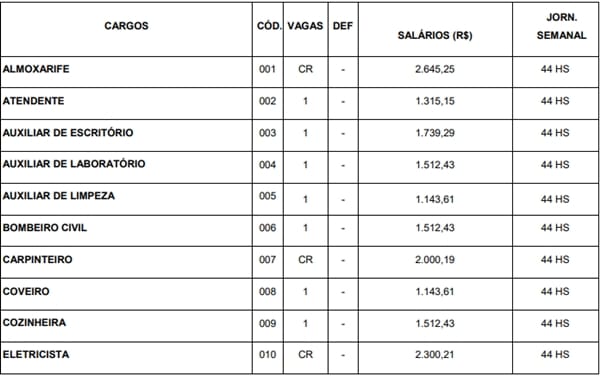 Os salários vão de R$ 1,1 mil a R$ 11,7 mil, com jornadas de 20 a 44 horas de trabalho semanais. Além da remuneração base, os contratados receberão auxílio alimentação, no valor de R$ 300.