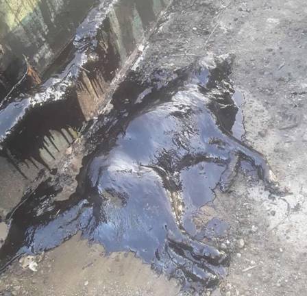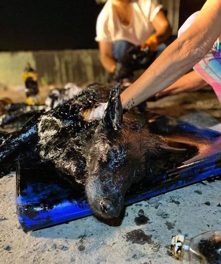 Uma equipe de resgate da ONG Proyecto 4 Patas conduziu uma operação que durou 9 horas para salvar um cão coberto de piche em Merlo, cidade na Grande Buenos Aires (Argentina). Não se sabe se o cão caiu em um reservatório de piche ou se a substância, usada para asfaltamento, foi jogada sobre ele deliberadamente.