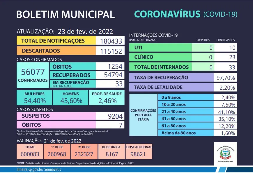 De acordo com a atualização da Secretaria de Saúde, há sete mortes suspeitas em investigação. Mais 152 casos de covid-19 foram confirmados desde a atualização de segunda-feira (21). Ao todo, são 56.077 pessoas diagnosticadas com a doença em Limeira – 54.794 estão recuperadas, 29 estão internadas e 1.381 são profissionais da saúde.