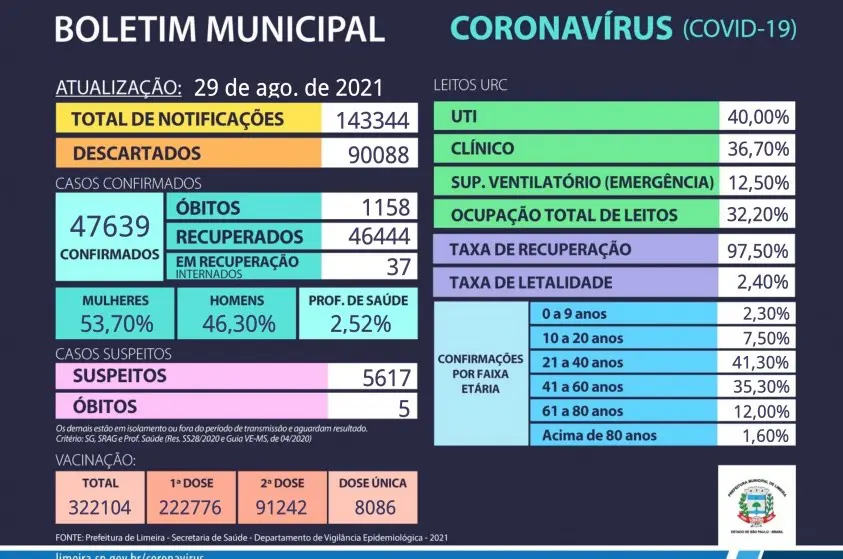 A Secretaria de Saúde também atualizou o número de vacinas contra a covid-19 aplicadas em Limeira até o momento. Ao todo, foram 322.104 doses aplicadas, sendo 222.776 da primeira dose, 91.242 da segunda e 8.086 doses únicas. Do total de vacinas aplicadas, 14.922 foram em profissionais da saúde; 97.872 em idosos; 134 em cuidadores; 1 em indígena; 26 relacionadas a um bloqueio; 3.028 em forças de segurança; 6.954 em profissionais da educação; 156 em pessoas com síndrome de Down; 120 em transplantados; 92 em pessoas em Terapia Renal Substitutiva; 2.174 em gestantes; 338 em puérperas; 1.116 em lactantes; 994 em pessoas com deficiência permanente; 22.855 em pessoas com comorbidades; 53 em trabalhadores do transporte aéreo; 1.984 em motoristas; 145 em pessoas em situação de rua; 3.292 em pessoas privadas de liberdade; 165.534 na população geral; e 314 em adolescentes.