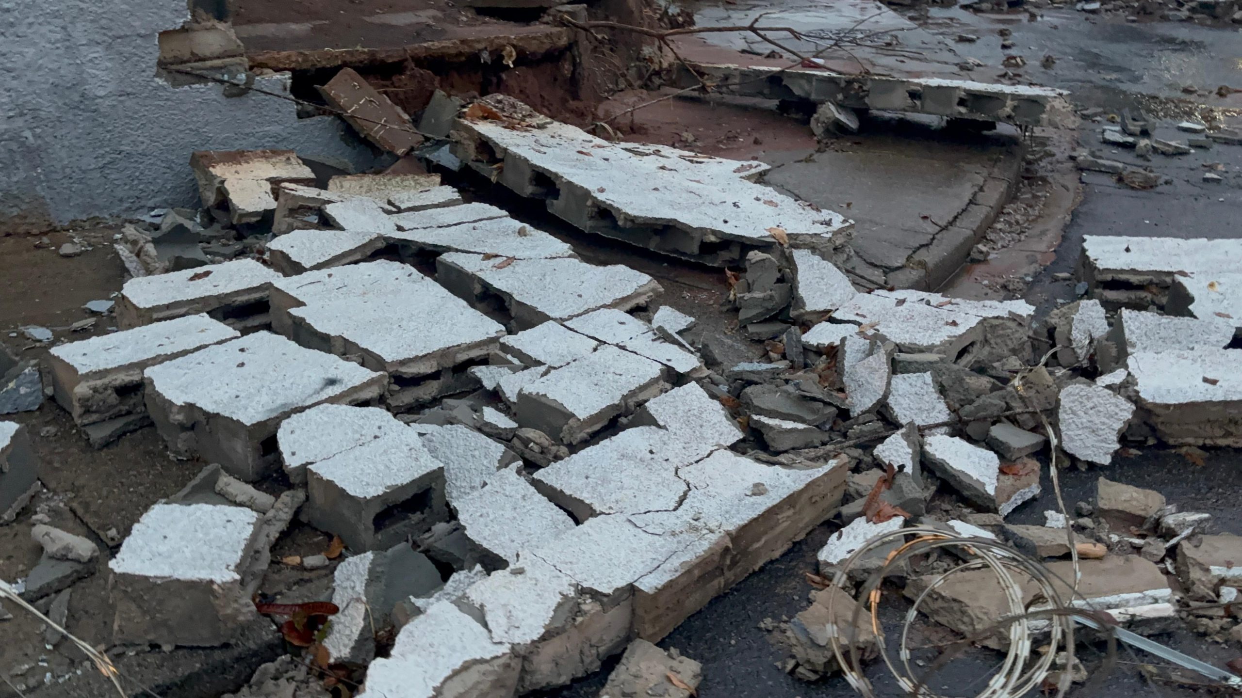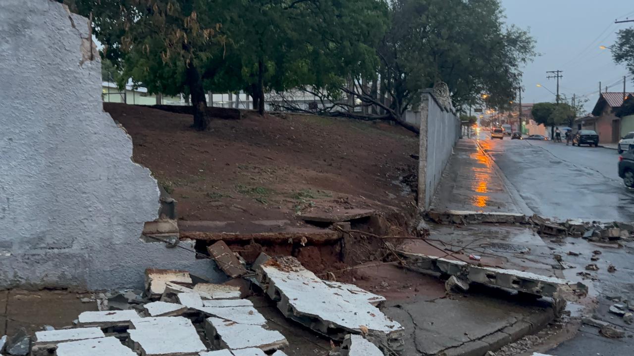 Parte do muro da Escola Estadual Prof. William Silva, na Rua Dario Roland, no Parque Novo Mundo, desabou.