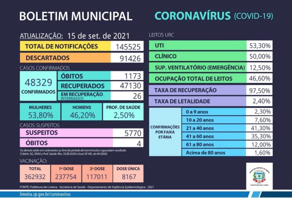 Dos 48.329 casos de covid registrados em Limeira, 53,8% dos pacientes são mulheres. Os dados são da Prefeitura, que atualizou o quadro desta quarta-feira (15). Limeira não registrou novas mortes, mantendo o total de 1.173 óbitos. Já a UTI da Humanitária tem 53,4% de lotação.