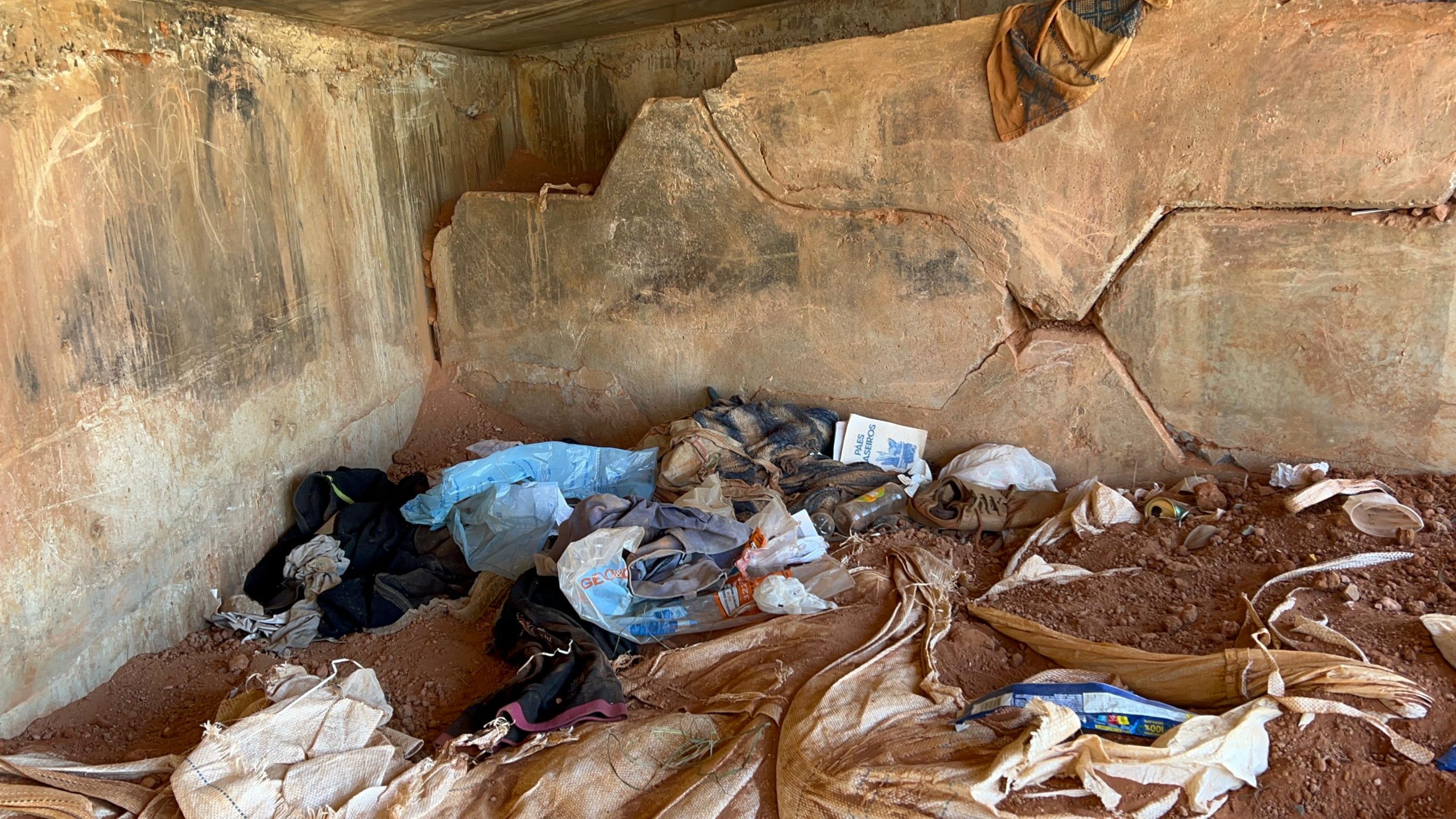 A poucos metros da via, em meio a um barranco, foi possível identificar sinais claros de permanência: roupas espalhadas, garrafas plásticas, calçados e outros vestígios que indicam que alguém tem vivido ali de forma precária.