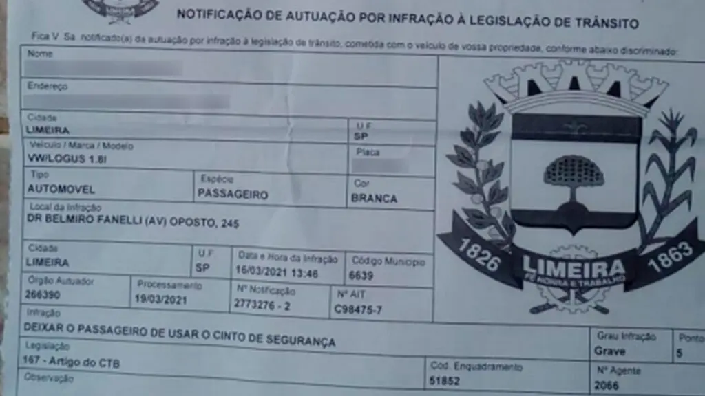Um motorista foi multado por um agente de trânsito no domingo (16), após levar o pai para ser vacinado contra covid-19 no drive-thru do Limeirão. A multa foi aplicada porque o idoso, com o veículo parado, teria retirado o cinto de segurança para abrir a camisa e tomar a vacina.