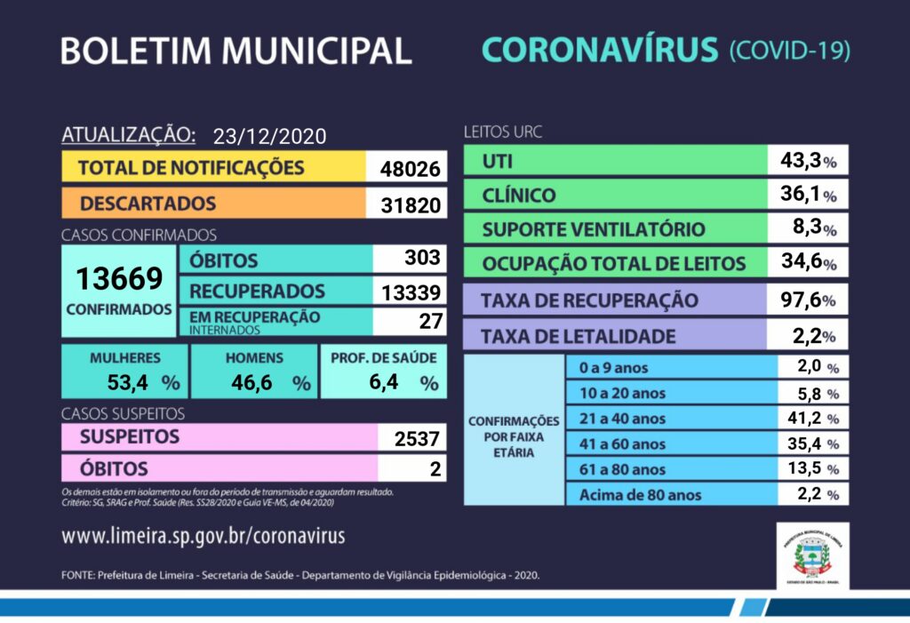 Dessas, 13.339 se recuperaram e 27 se recuperam internadas. Quatro pacientes de outras cidades também se recuperam em Limeira. O total de notificações sobre a doença chega a 48.026, sendo 31.820 descartados. Há 2.537 registros suspeitos em investigação. O número de profissionais de saúde com confirmação para covid-19 é de 878.