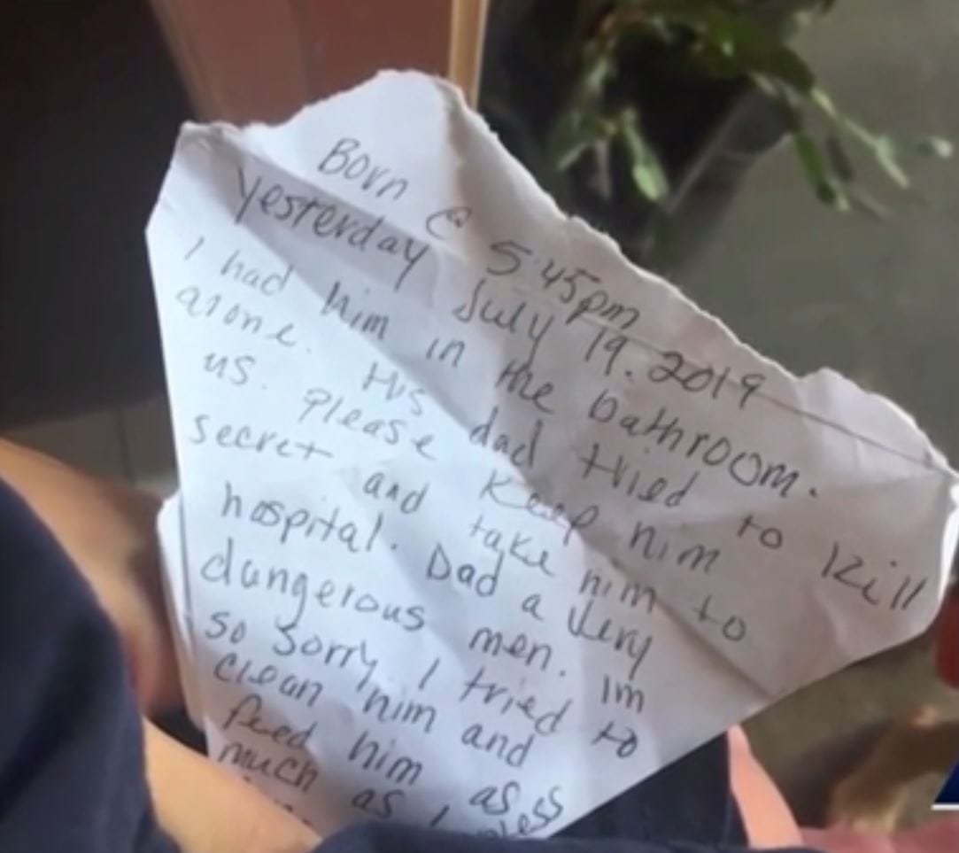 Um recém-nascido, de apenas 1 dia, foi deixado na porta de um apartamento em Orlando, Flórida, Estados Unidos, com um bilhete emocionado da mãe. “Nascido às 17h45, 19 de julho de 2019, ontem. Tive ele no banheiro sozinha. O pai dele tentou nos matar. Por favor, mantenha-o escondido e leve-o para o hospital. O pai é um homem muito perigoso. Me desculpe, tentei limpá-lo e alimentá-lo”, dizia a carta.