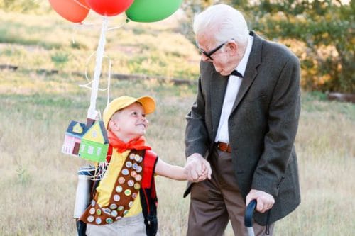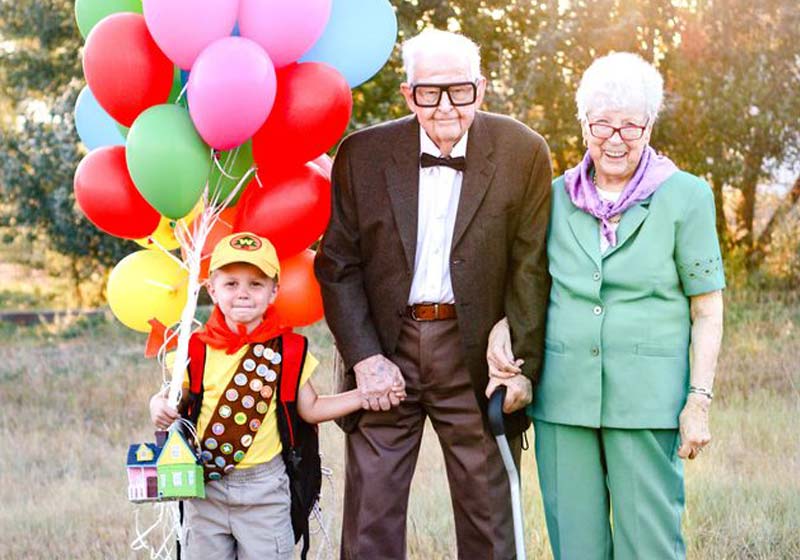 Os bisavós de Elijah, de 5 anos – que adora o filme “Up, Nas Alturas”, da Pixar – se vestiram como as personagens do desenho, Ellie e Carl, para comemorar o aniversário do menino.