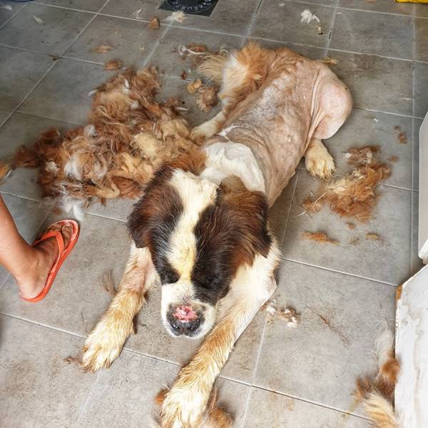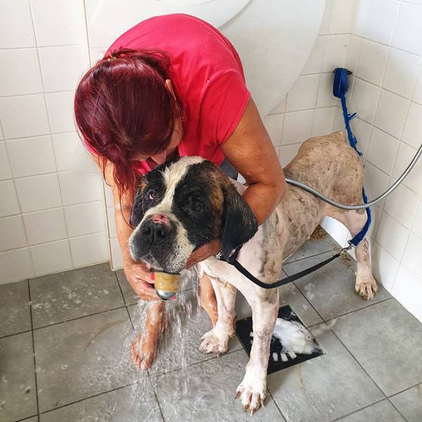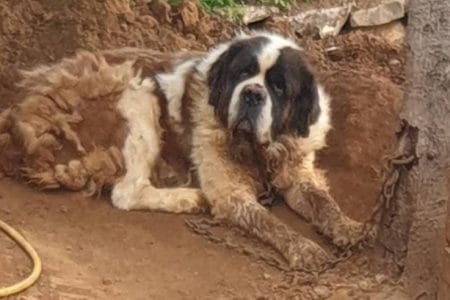 Depois de oito anos acorrentada, uma cadela da raça São Bernardo foi resgatada. O animal foi encontrado em uma propriedade abandonada na Ilha da Madeira, em Portugal.