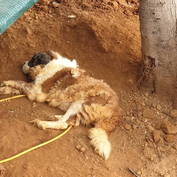 A situação em que Kitty foi encontrada gerou muita tristeza. Ela foi localizada acorrentada à uma árvore, claramente fraca e doente, e até tentou latir com a chegada da equipe, mas não conseguiu, devido à tosse.