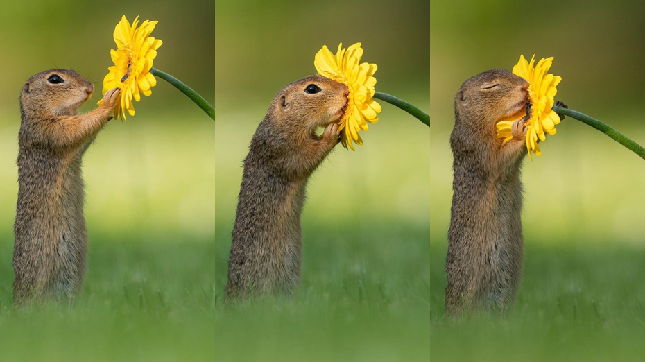 Fotos do exato momento em que um esquilo cheira uma flor estão fazendo sucesso ao redor do mundo.