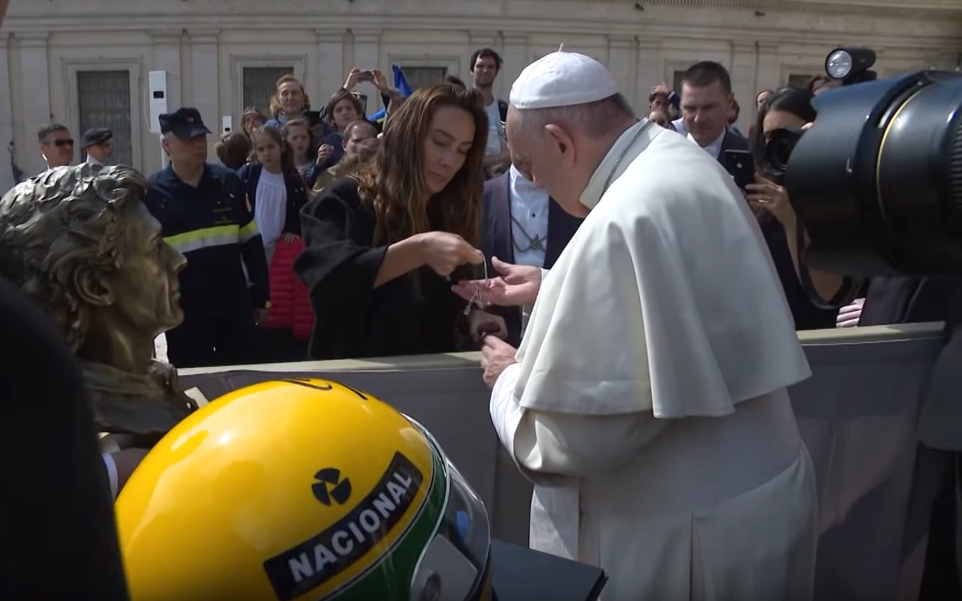 Nos 25 anos de sua morte (que serão completados no próximo dia 1 de maio), Ayrton Senna, o ídolo do esporte mundial, foi lembrado nesta quarta-feira, 17 de abril, na Praça São Pedro quando o Papa Francisco recebeu das mãos de sua sobrinha uma escultura em bronze do piloto e o capacete dele.