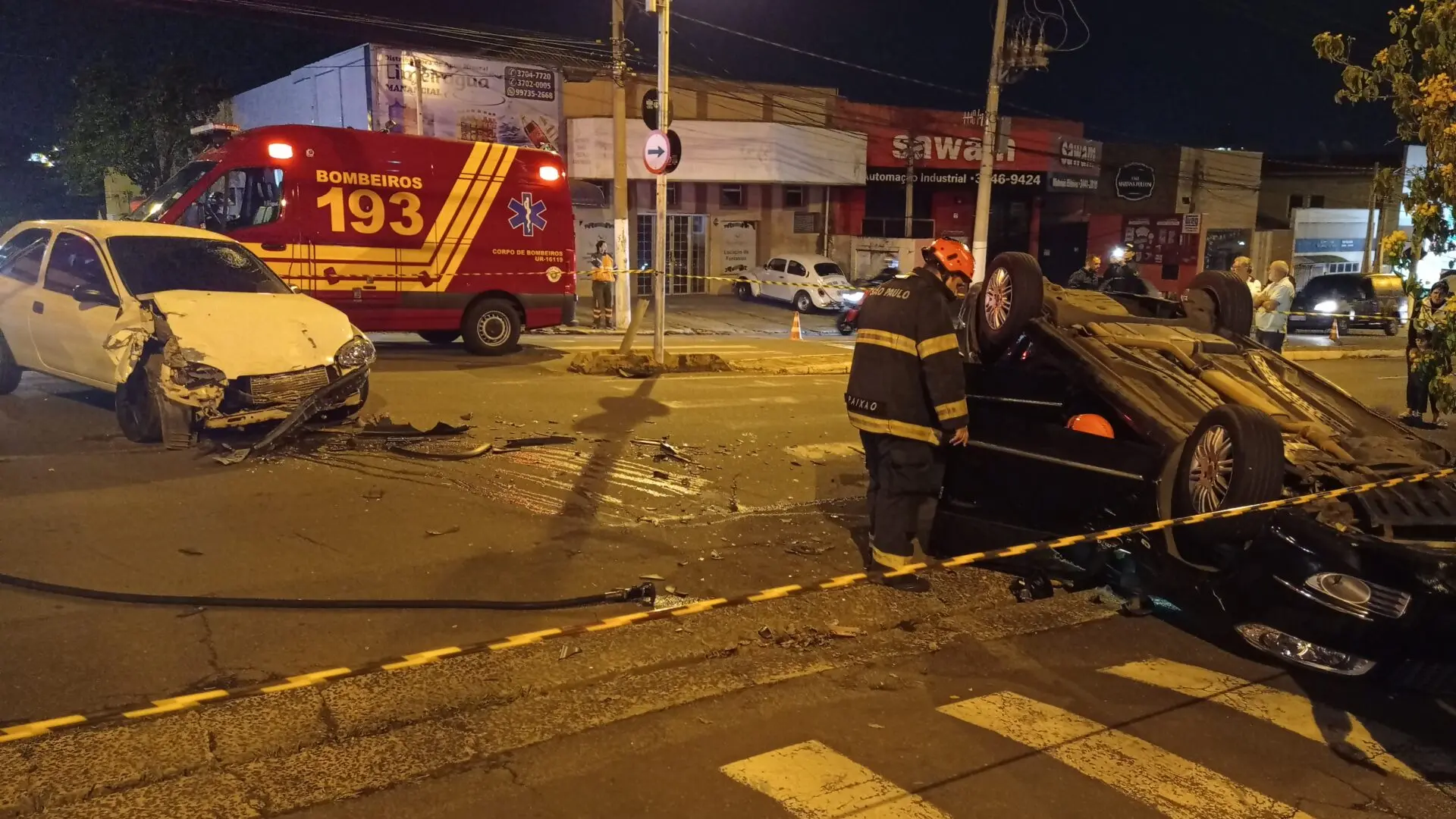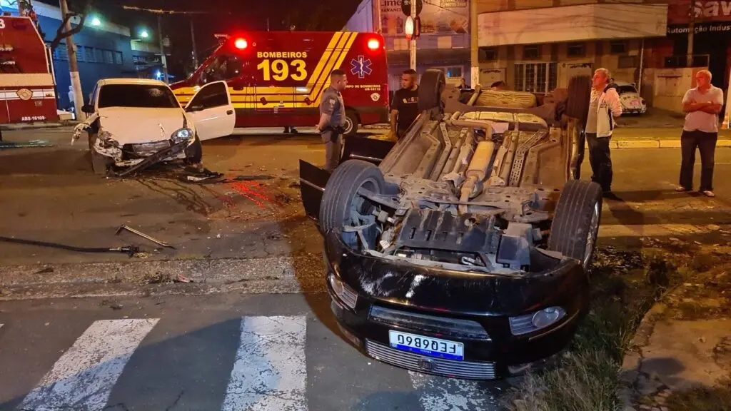 Um acidente de trânsito, seguido de capotamento, fecha a avenida Laranjeiras, na noite desta segunda-feira (20). Um GM Corsa, ocupado por um rapaz, de 20 anos, bateu na lateral de um Fiat Linea, que acabou capotando.