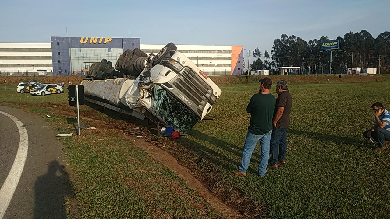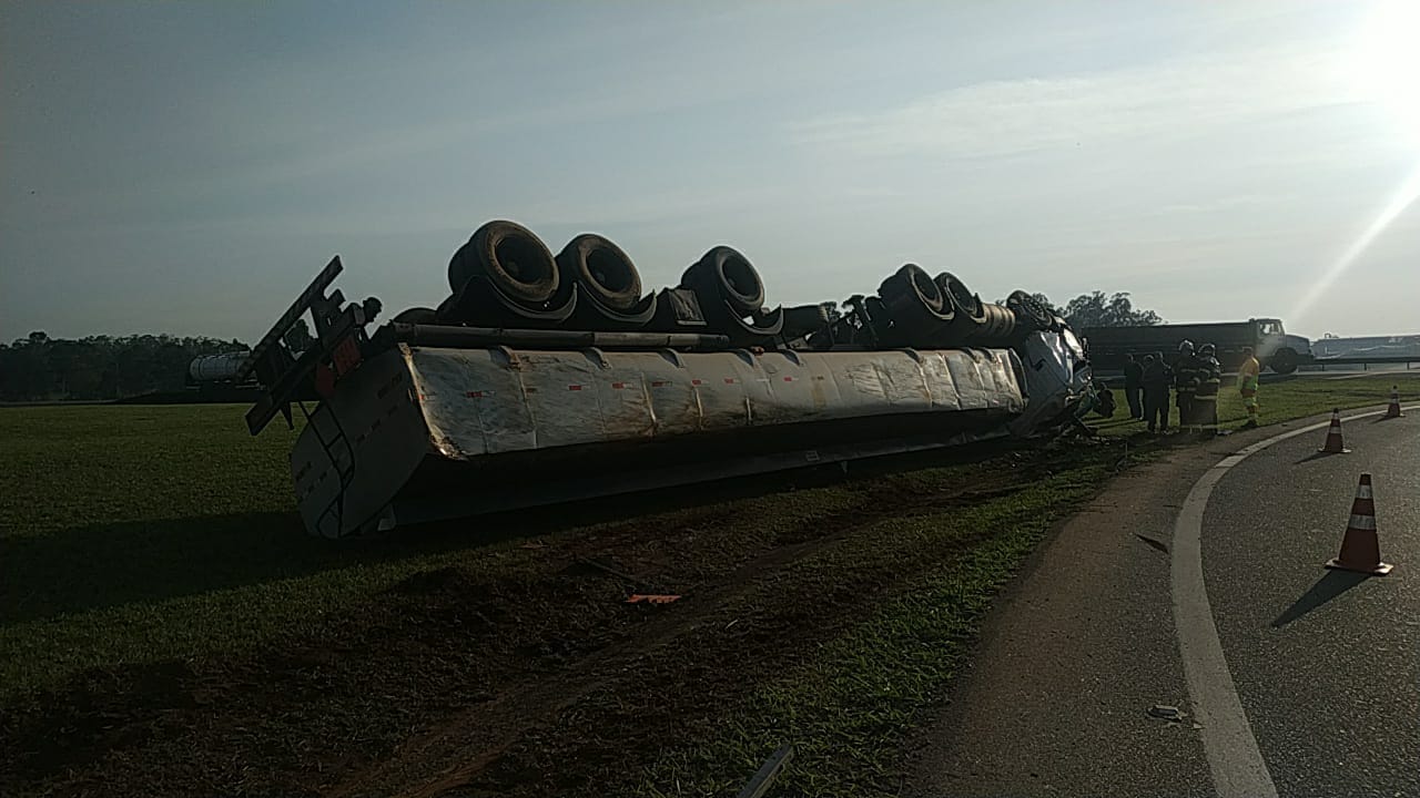 Caminhão-tanque tomba no trevo de acesso da Rodovia Anhanguera, em Limeira