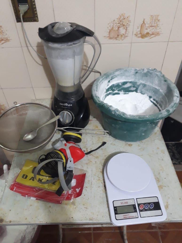 Ainda segundo consta no registro policial, dentro da casa, os policiais surpreenderam os outros dois detidos e apreenderam material usado na produção da droga – como balanças de precisão, prensas, peneiras e até liquidificadores. Na casa ainda foram localizadas 138 quilos de cocaína e 3,4 quilos crack. Três carros e uma moto – que seriam utilizados para o transporte da droga – também foram apreendidos.