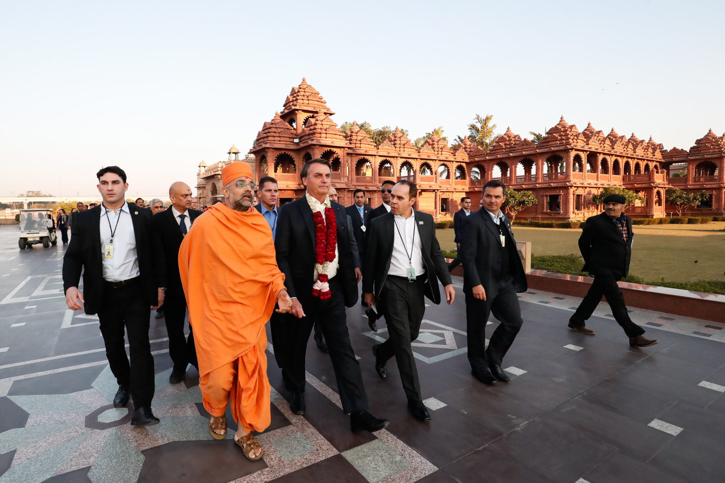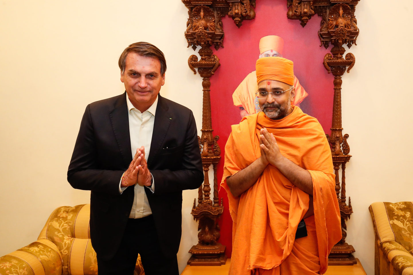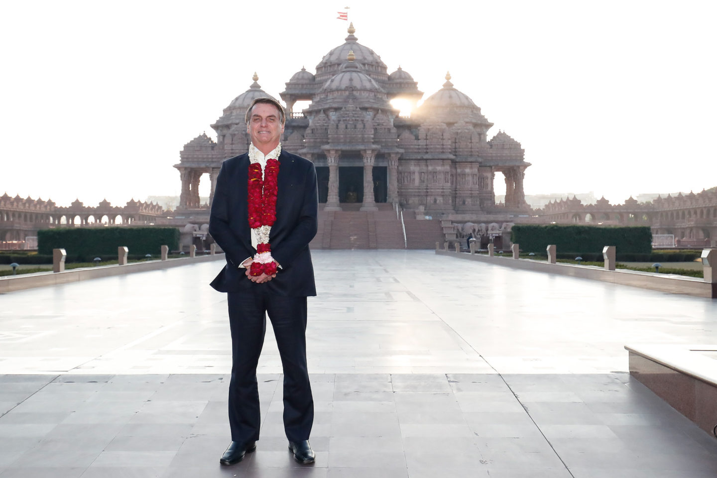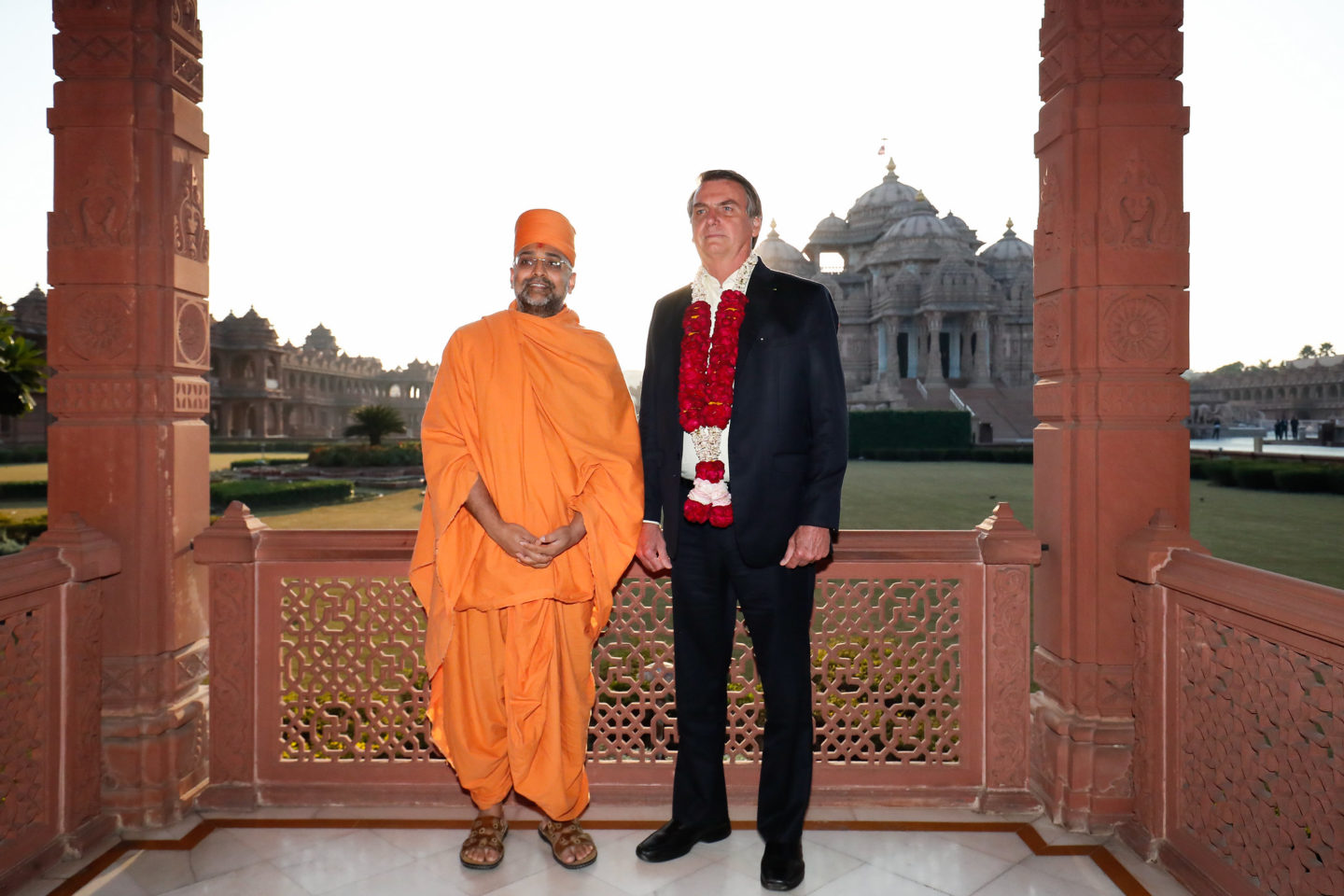 O brasileiro foi recebido no hotel com uma guirlanda de flores, típica hindu, e um bindi, marquinha feita com cúrcuma na testa. Em sua primeira saída, Bolsonaro foi ao templo Akshardham, maior templo hindu construído neste século. Ele é da seita Swaminarayana, do guru Sahajanand Swami.