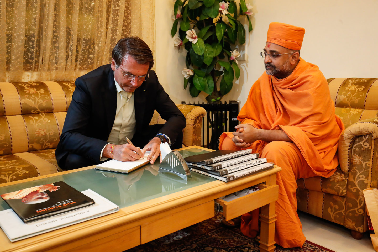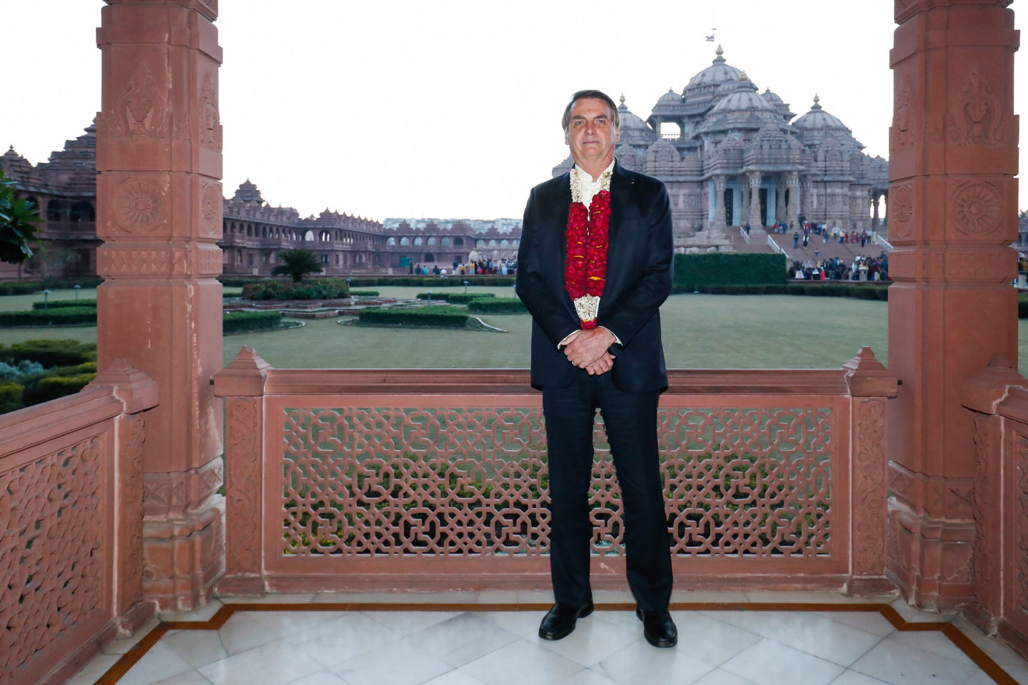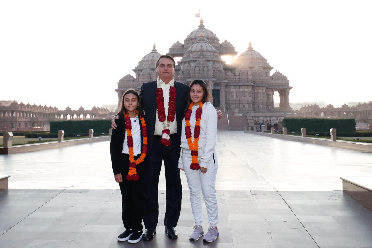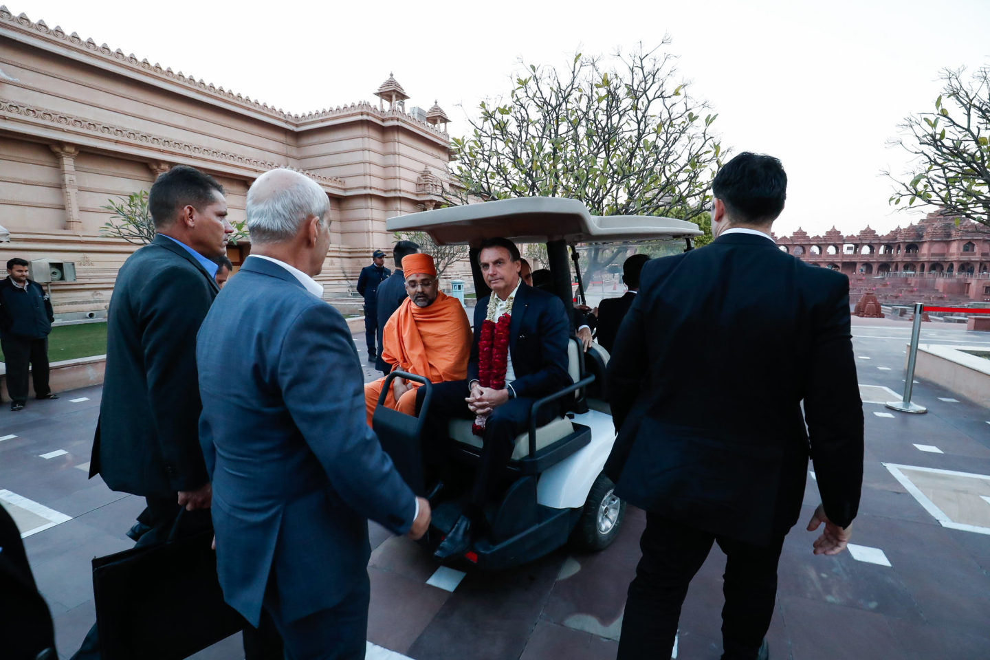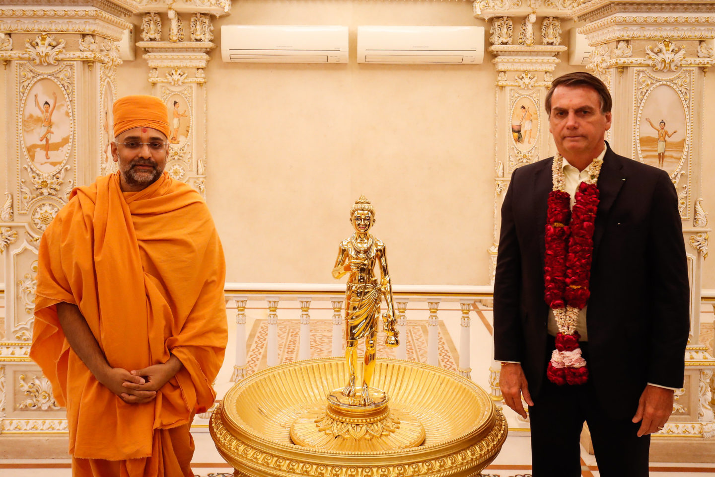 O brasileiro foi recebido no hotel com uma guirlanda de flores, típica hindu, e um bindi, marquinha feita com cúrcuma na testa. Em sua primeira saída, Bolsonaro foi ao templo Akshardham, maior templo hindu construído neste século. Ele é da seita Swaminarayana, do guru Sahajanand Swami.