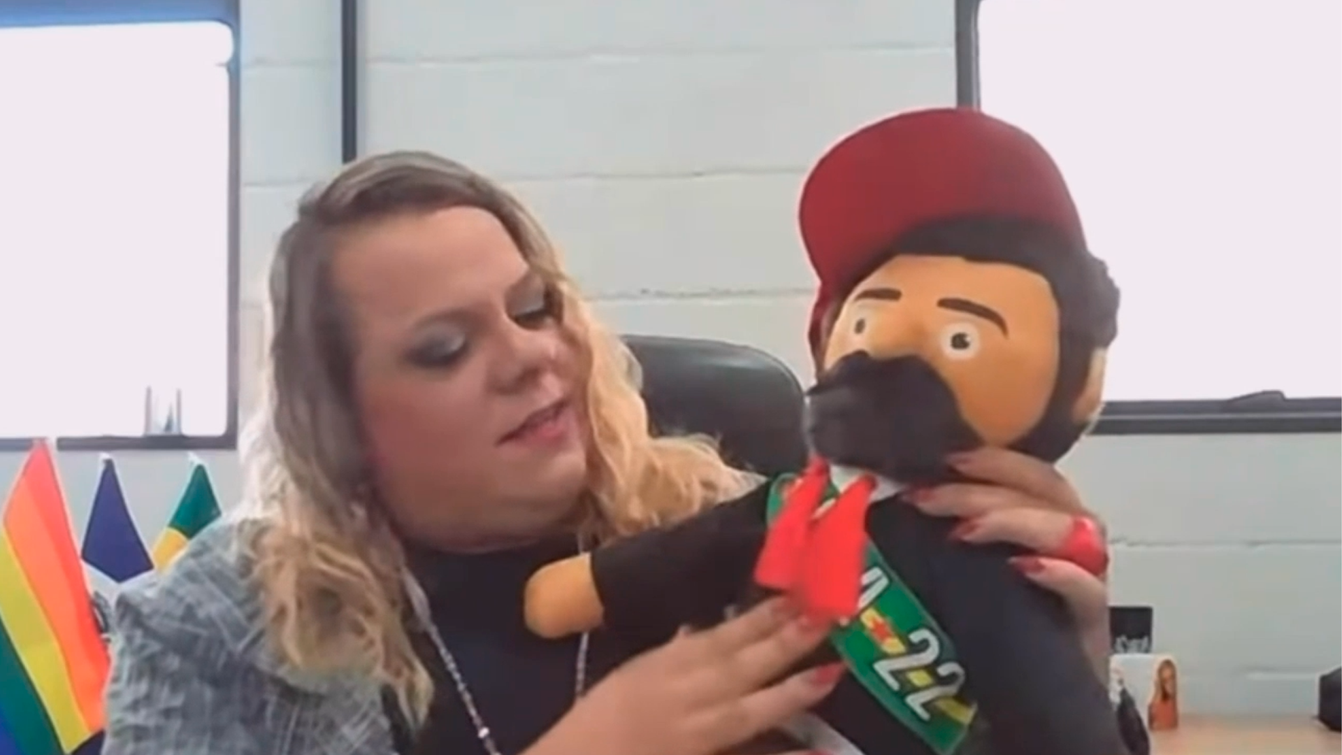 A vereadora Isabelly Carvalho (PT), durante entrevista ao Educadora Meio Dia, mostrou um mascote que mantém em seu gabinete na Câmara Municipal de Limeira (SP). Trata-se do ‘Lulinha’.