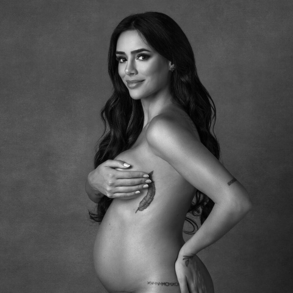 Nas imagens, em preto e branco, ela aparece sem roupa e cobrindo os seios apenas com a mão, além de exibir a barriga de uma gestação avançada. “Felicidade é carregar o mundo inteiro dentro de você”, escreveu na legenda. Os registros foram feitos pela fotógrafa Mari Righez, especializada em clicar gestantes. Entre os clientes famosos dela, estão Tata Estaniecki, Thassia Naves e Romana Novais, mulher do DJ Alok.